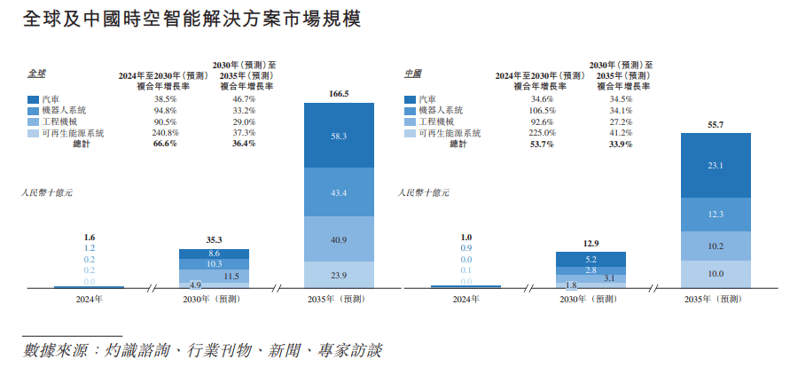 受下逛使用快速普及的鞭策,全球时空智能处理方案市场估计将从2024年的人平易近币16亿元光鲜明显增加至2030年的人平易近币353亿元,并进一步正在2035年达到人平易近币1,665亿元。这意味着从2024年至2030年的复合年增加率高达66。6%,从2030年至2035年的复合年增加率则为36。4%。